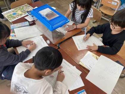 新しい仲間の亀太郎の観察をしました。カメを一生懸命見ながら、亀の特徴や様子を捉えて観察していました。大きくなるのが楽しみです。