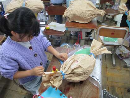 紙をしわくちゃにして、ぎゅっとしたくなる友達を作っています。