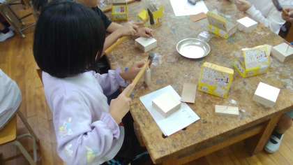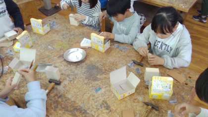 図工の「くぎうちトントン」では、かなづちを使って、くぎを打つという学習をしました。まっすぐ打てるように何度もやり直しながら、思い思いの作品を仕上げていました。