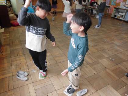 休み時間に面白いあそびをしていました。新聞の上にどのくらいの大きさまで乗ることが出来るのかじゃんけんをしながら楽しんでいました。とっても楽しそうです。