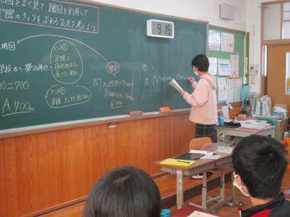 この日の算数の学習では,これまで学習してきた拡大図と縮図を使って,地図上にある目的地までの実際の距離を求める方法を考えました。