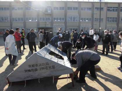 19日(日)に吉祥院学区総合防災訓練が行われました。都市直下型の地震発生を想定し、倒壊家屋からの救出訓練や、応急処置訓練などが行われました。地域の安全を守るために、参加された地域の方々は、それぞれの訓練に真剣に取り組んでおられました。ジュニア消防団として訓練のお手伝いをしていた子どもたちもいました。災害時のために、地域の方々がこのような訓練を行っているということを学校でも子どもたちに伝えていきたいと思います。