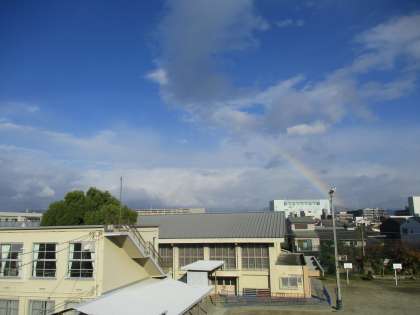 朝,教室から窓の外を見ると大きな虹が!