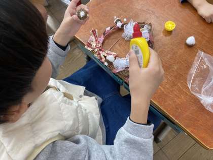 あさがおのつるで作ったリースに飾り付けをしました。リボンや綿をつけ、それぞれ思い思いに飾り付けをしていました。可愛らしいリースが出来たので、またお家で飾って下さい。