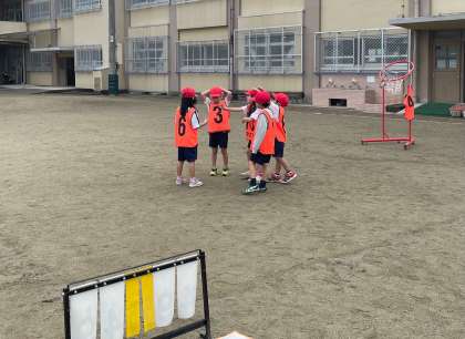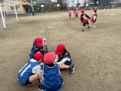 と言いながら、作戦会議をしていました。ルールも理解できるようになってきて、とても上手に声を掛け合いながら、パスをつなぐことができていました。