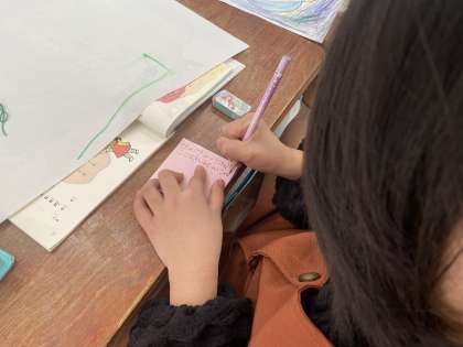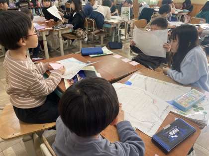 外国の昔話の中から自分の好きな本を選んで、好きなところやおもしろかったところを紹介しあいました。友だちの話を聞いて、付箋に聞いた感想を書き、交換しました。「おもしろそうだから読んでみたいな」や「大きな声で発表できていたよ」など、あたたかいコメントを書いて友だちに渡していました。これを機会に、外国の昔話にたくさん触れてほしいです。