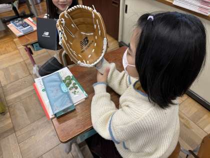 グローブを見たり、はめたりして感激していました。