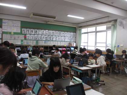 学習発表会に向けて地域の方々とのかかわり方についてロイロノートでまとめていました。ほかの班との比較でよりつたわりやすいスライドを作るために線を引っ張ったり、写真を有効活用していました。