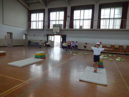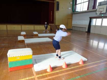 「またぎごし」や「またぎのりおり」など、とびばこ運動につながる基本的な動きからはじめ、今日は、縦開脚跳びや横開脚跳びに挑戦しました。初めのうちは不安な様子でしたが、自分のめあてに応じて様々な段を跳ぶことに挑戦していました。