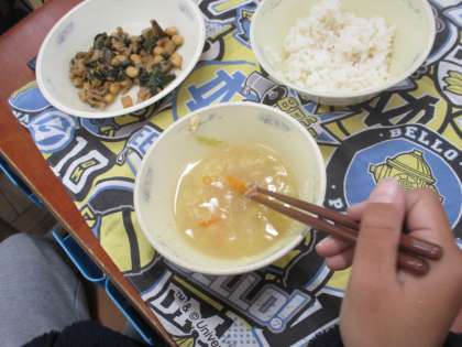 給食のメニューに、星や車、お花などの形ににんじんが型抜きされています。このにんじんが入っていれば、「幸せなことがあるかも!」ということから、クラスでは“幸せにんじん”と言っています。