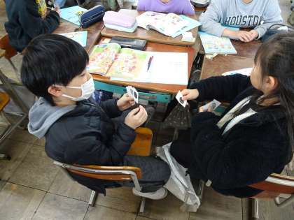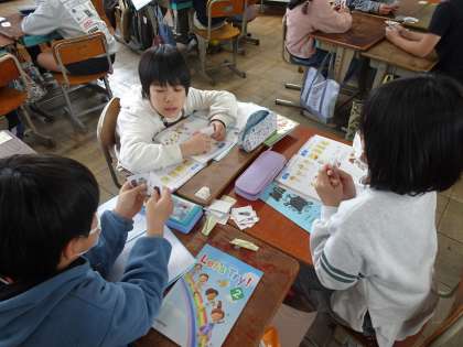 外国語活動の様子です。欲しいものを尋ねたり答えたりする言い方に慣れるためのゲーム(Go Fish Game)をしています。楽しみながら表現に慣れていっていました。