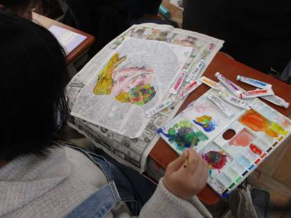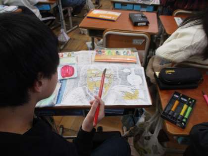 刷った後に,絵の具で色を付けて完成させています。