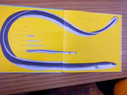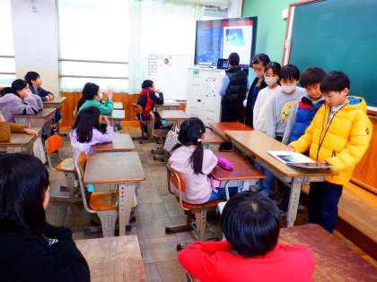 「読み聞かせ係」さんが絵本の読み聞かせをしています。この絵本は、国語科で学習した『うなぎのなぞを追って』に書かれていた、ウナギの一生のことがわかる内容でした。学習に関連した絵本を探して読んでくれたので、聞いていたみんなも「ほんまや〜。」と興味を深めていました。
