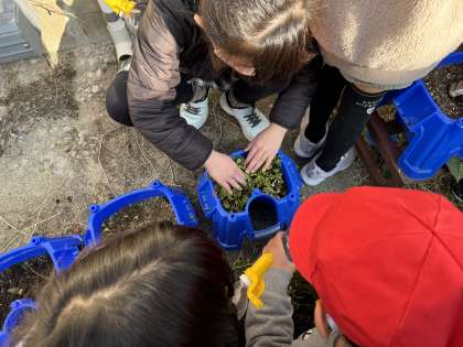 チューリップの様子を見に行きました。雑草が生えていた人は雑草を抜き、球根に土がかぶってなかった人は土をかぶしました。3月にどんな色のチューリップが咲くのか、子どもたちはウキウキしていました。