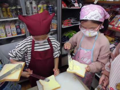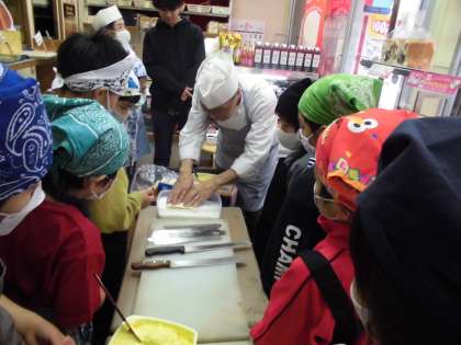 5時間目に吉祥院の地域のパン屋さんでパン作りをさせてもらいました。パンにバターと砂糖を塗り、パン切り包丁で切る。初めての体験の子が多く、とても楽しそうでした。