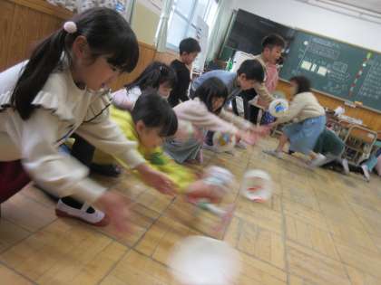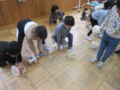 そして、誰が遠くまで転がるか、うまくまっすく転がるか、みんなで楽しく転がして遊びました。