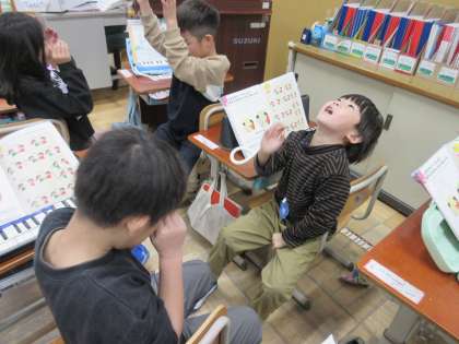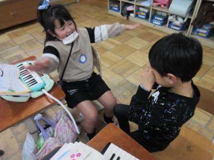 日本のわらべうたの、「おちゃらかほい」をして楽しんでいます。最初のころは、リズムに合わせて友達と手を重ねるのが難しそうでしたが、最近は上手にできていますね。勝ったときと、負けたときのジェスチャーもみんなそれぞれ上手に表現しています。