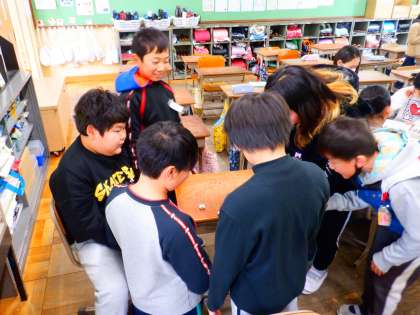 休み時間に消しゴム落としをして遊んでいる子たちがいました。たくさんの人数でやると盛り上がっています。