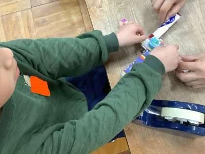 5日(火)の生活単元学習で、牛乳パックとペットボトルのキャップ,キラキラ折り紙を使って「レインボーごま」を作りました。回すとキラキラ光ってとてもきれいでした。