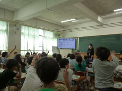 今年の理科は、専科の先生に教えてもらいます。担当の先生から自己紹介のクイズをしてもらったあと、どのように理科の学習を進めていくのかをお話してもらいました。