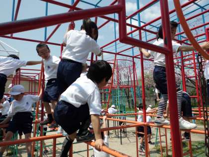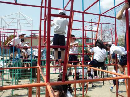 今日は1年生初めての体育でした。かけっこや遊具の登り方の学習をしました。まっすぐ一生懸命に走る子どもたちの表情はとても素敵でした。