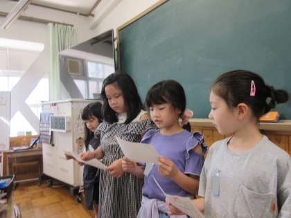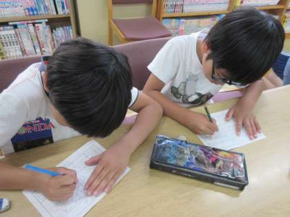 生活科で野菜を育てたり、虫を観察したりする中で、たくさんの不思議や疑問がうまれました。「ナスは花が咲いた後どうなるの?」「おんぶバッタの体の色は、茶色と黄緑でどうして違うの?」といって、それぞれ知りたいことについて調べていました。その後「バッタは生まれつき色がきまっていると本に書いてありました。」と調べたことを上手に発表することができました。