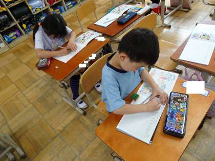 うつしたかたちに せんをつけたり、いろをぬったりしました。