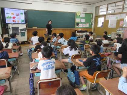 栄養教諭の先生が「やさいのひみつ」について教えにきてくれました。