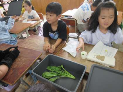 班にわかれて色々な野菜で「やさいクイズ」を作って問題を出し合いました。