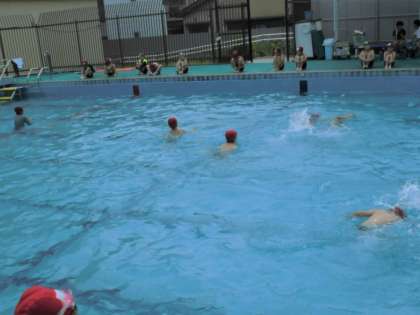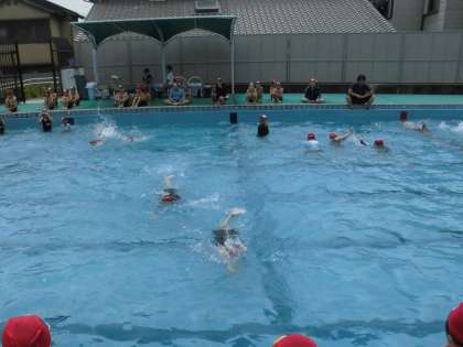 水泳学習が始まって2週間。水泳学習にも慣れ、頑張っている子どもたち。けのびやバタ足も上達し、これからは新しい泳法や泳ぐ距離をのばすなど、自分でめあてをもって、取り組んでほしいと思います。