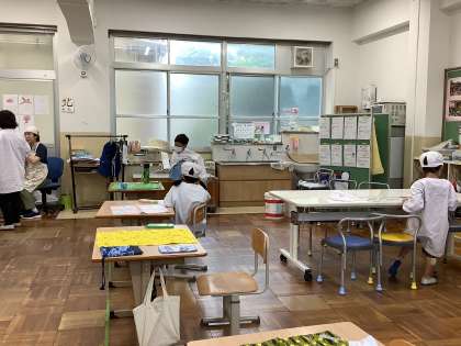 学校生活に慣れてきた1年生も給食当番などの学級活動に参加しています。