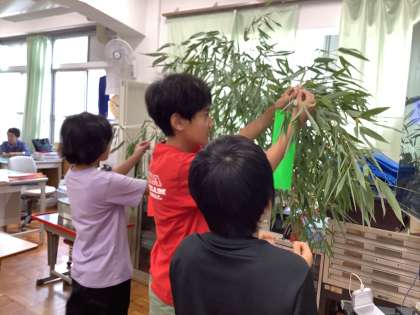 吉祥院商店会からいただいた笹に,早速七夕の飾りつけをしました。