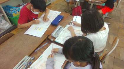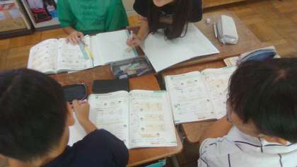 算数では「2けたでわる筆算」の学習をしています。今日は4桁以上の数を割る計算にチャレンジしました。数字が大きくなると難しくなりますが、班の人たちと相談して、解き方を一生懸命考えている子どもたちです。
