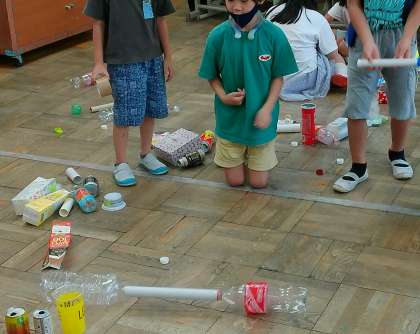 生活科で「あそんでためしてくふうして」のころがすあそびを行いました。