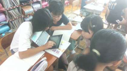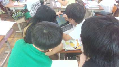 算数科「整数」の学習では、縦6センチメートル、横8センチメートルのタイルをどのように並べると正方形を作ることができるのかを考えました。各自が作った正方形の中から、2種類の正方形を比較しながらグループの友だちと正方形になる法則について検証していきました。難しい課題でしたが、各グループがしっかりと話し合い、「6と8の公倍数を使えば、正方形をかいたりタイルを並べたりしなくても1辺が何センチメートルの時に正方形になるかが分かる!」と考え方を導き出していました。