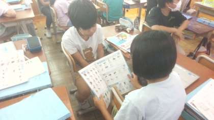 英語科“Who’s this?”の学習では、身近な人を紹介するというゴールに向かって、紹介する言い方や、紹介する人の性格やできることについての表現を学んでいます。絵カード辞書なども進んで活用して自分の言いたいことを伝えようとしている姿が素敵です。