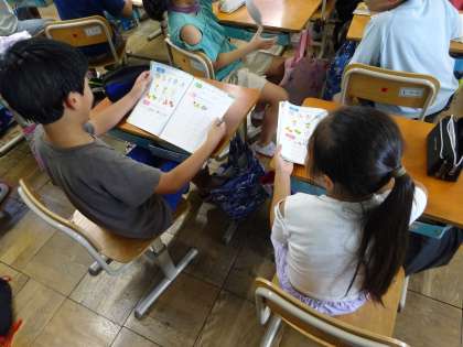 今日はステレオゲームをしながら「What do you like?」と「I like〜.」の表現に慣れ親しみました。後半には隣の人のすきな色・フルーツ・スポーツを予想してから質問しあいました。