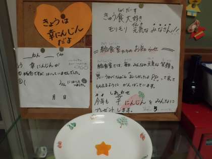 しあわせにんじんが入っていた人はラッキー!給食室で写真を撮ってもらい,その写真は翌日の「給食室からこんにちは」に掲載されます。
