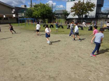 理科「かげと太陽」の学習で太陽とかげの位置関係を調べました。まずは「かげふみ遊び」をしてかげの向きを確認しました。みんな同じ向きにできているので、かげの向きに気をつけるとにげやすいことに気づきました。その後遮光板を使って太陽の位置を調べました。かげが太陽の反対側にできることが分かりました。