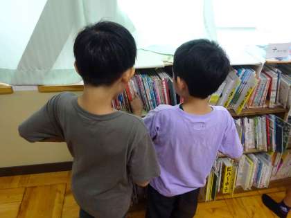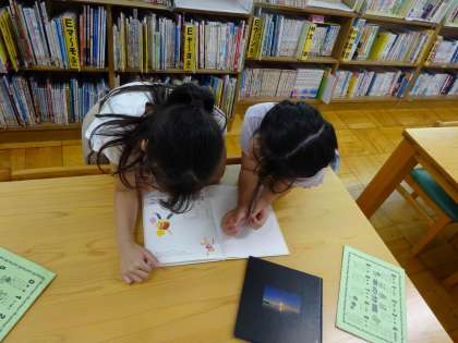 1年生の先生から「1年生が本を好きになるような本をしょうかいしてほしい」という依頼を受け、今日は絵本探しをしました。気になる本を少し読んでみたり、1年生のときのことを思い出したりしながら本を選んでいました。