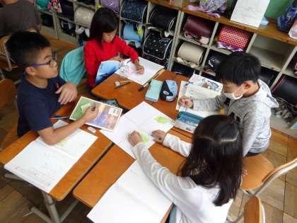 国語科「おすすめの一さつをしょうかいします」の学習で今日は1年生にお勧めする本をグループで決める話し合いをしました。