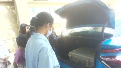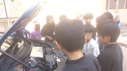 社会科の学習で次世代自動車について学び、この日は実際に燃料電池車の見学をしました。「排気ガスが出る場所がない!」「後ろに乗ってる箱って何?」などガソリン車との違いに興味津々の子どもたちでした。