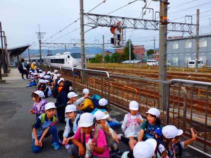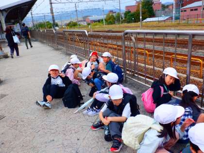 待ちに待った遠足の日。西大路駅から電車に乗りました。子どもたちは、通り過ぎる電車にも興味深々でした。
