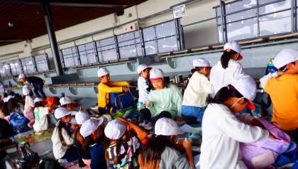 雨だったのでイルカスタジアムでお弁当を食べました。子どもたちは、お家の方につくっていただいたお弁当をおいしそうに食べていました。朝早くから、お弁当のご準備、ありがとうございました。