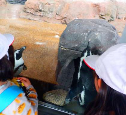 お弁当を食べた後は、水族館の中をもう一度見学しました。子どもたちは、ペンギンに注目して見ていました。よく見るとペンギンが巣の中で卵をあたためていました。ペンギンが飼育員さんから魚をもらって食べる様子も見ることができました。
