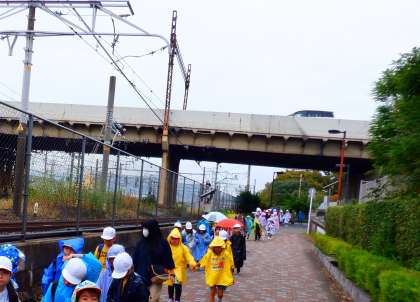 楽しかった水族館での見学も終わり、帰っている様子です。雨もパラパラ降ってきたのでレインコートを着たり、傘をさしたりして帰りました。子どもたちは、「とてもつかれたけれど楽しかった!」と感想を話していました。解散式では、校長先生からもほめられて、うれしそうな子どもたちでした。たくさんのことを学ぶことができた、2年生の校外学習になりました。保護者の皆様、ご支援ご協力、本当にありがとうございました。