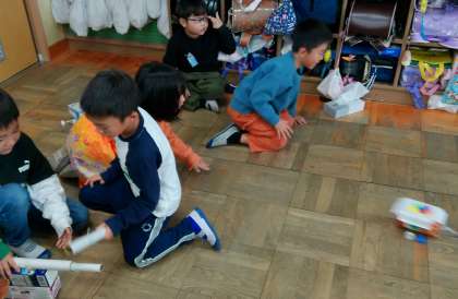 友達が作ったもので遊ぶことで、自分では思いつかなかった工夫に気づくことができ、「○○さんのおもちゃが、いろいろな音がして気持ちよかった。」など、お互い刺激を与え合えていて、とても有意義な時間となりました。