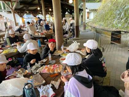 パンにキャベツとウインナーをはさんで、牛乳パックにつめて、火をつけています。外側の牛乳パックが燃え尽きたら出来上がりです。