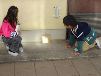理科「光のせいしつ」の学習で鏡ではね返した日光を重ねると、明るさやあたたかさはどうなるのかを調べました。