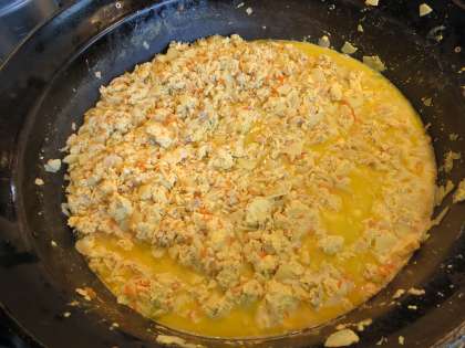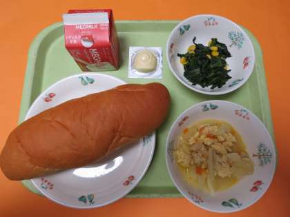 「スパニッシュ」とは「スペイン風」という意味で,本場ではフライパンの形のままに丸く大きく作ります。給食では大きな釜を使って作るので,少し違った形での実施です。ベーコン・たまねぎ・にんじん・じゃがいもをいため,ふんわりたまごで包みました。